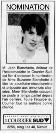 Suzanne Blanchette se souvient très bien du jour où elle a mis les pieds pour la première fois dans les bureaux du Courrier Sud, alors situés sur le boulevard Louis-Fréchette à Nicolet.