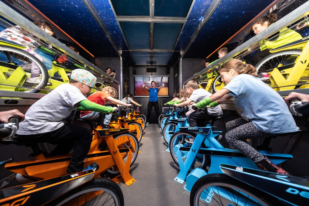 Nommé Véhicube spatial étant donné sa thématique de l’espace, les élèves s’informeront des habitudes alimentaires, sur terre comme dans l’espace, notamment à l’aide de jeux interactifs. Ils auront aussi l’occasion de pédaler en peloton dans un univers galactique avec les autres élèves de leur classe. En plus des activités dans le Véhicube spatial, les élèves pourront participer à des séances d’entraînement ludique diversifié en groupe, telles que du yoga, de la Zumba, etc.
