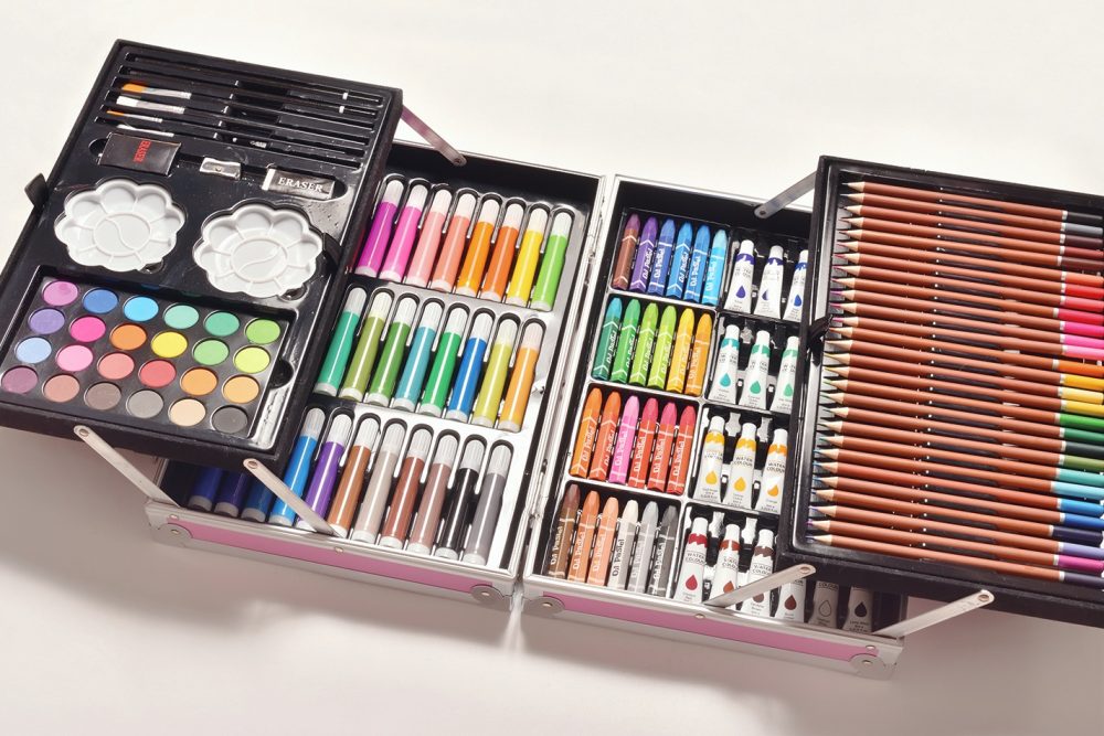 Mallette artistique : la mallette comprend une variété de fournitures d’art (ex. : crayons de bois, marqueurs, pastels, aquarelles) destinées aux enfants ou aux artistes accomplis.