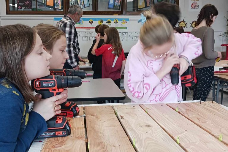 En 55 minutes, ils ont été en mesure de tout faire grâce à des gabarits spéciaux leur permettant de mesurer le bois et de placer les montants et les planches aux bons endroits. Ils ont percé, vissé et posé des pentures et des crochets pour compléter le travail. Le résultat : un composteur entier qui pourra gérer plus de 200 kg de matière organique par année à l’école.